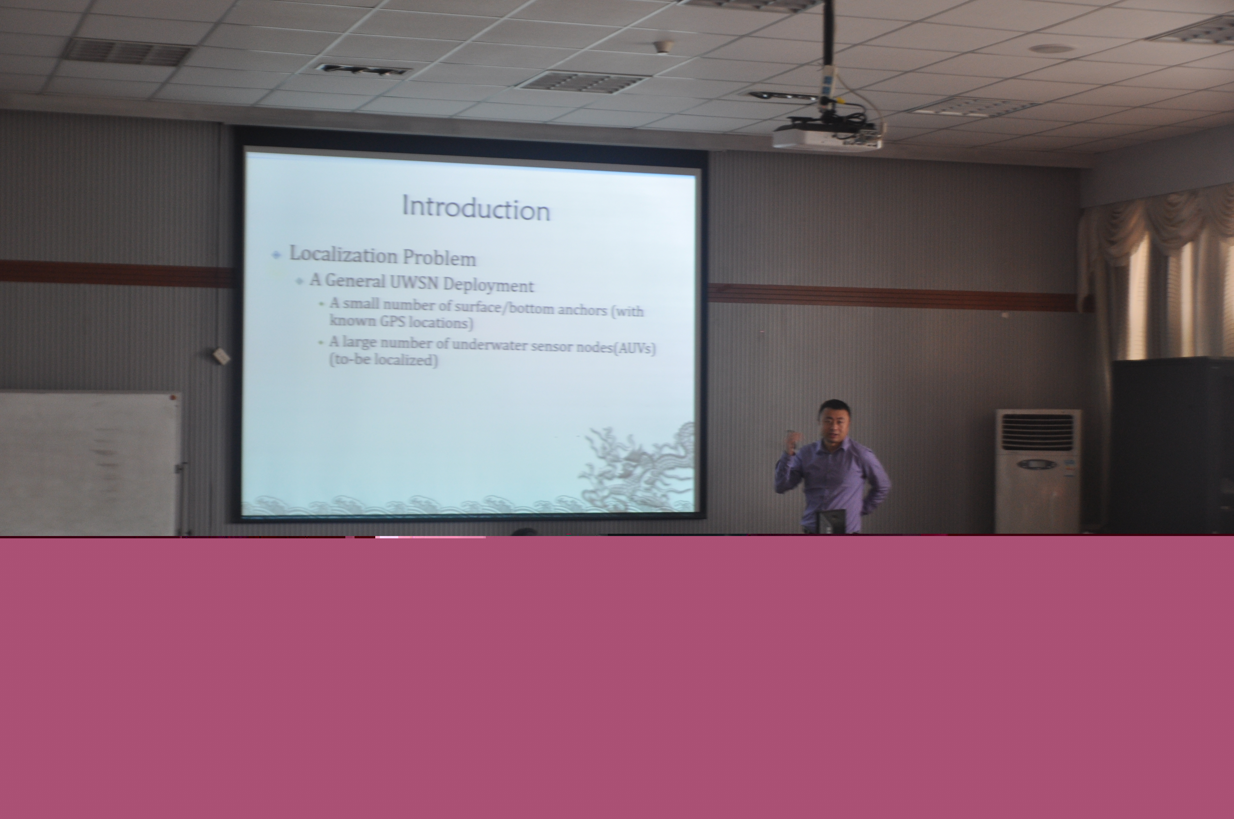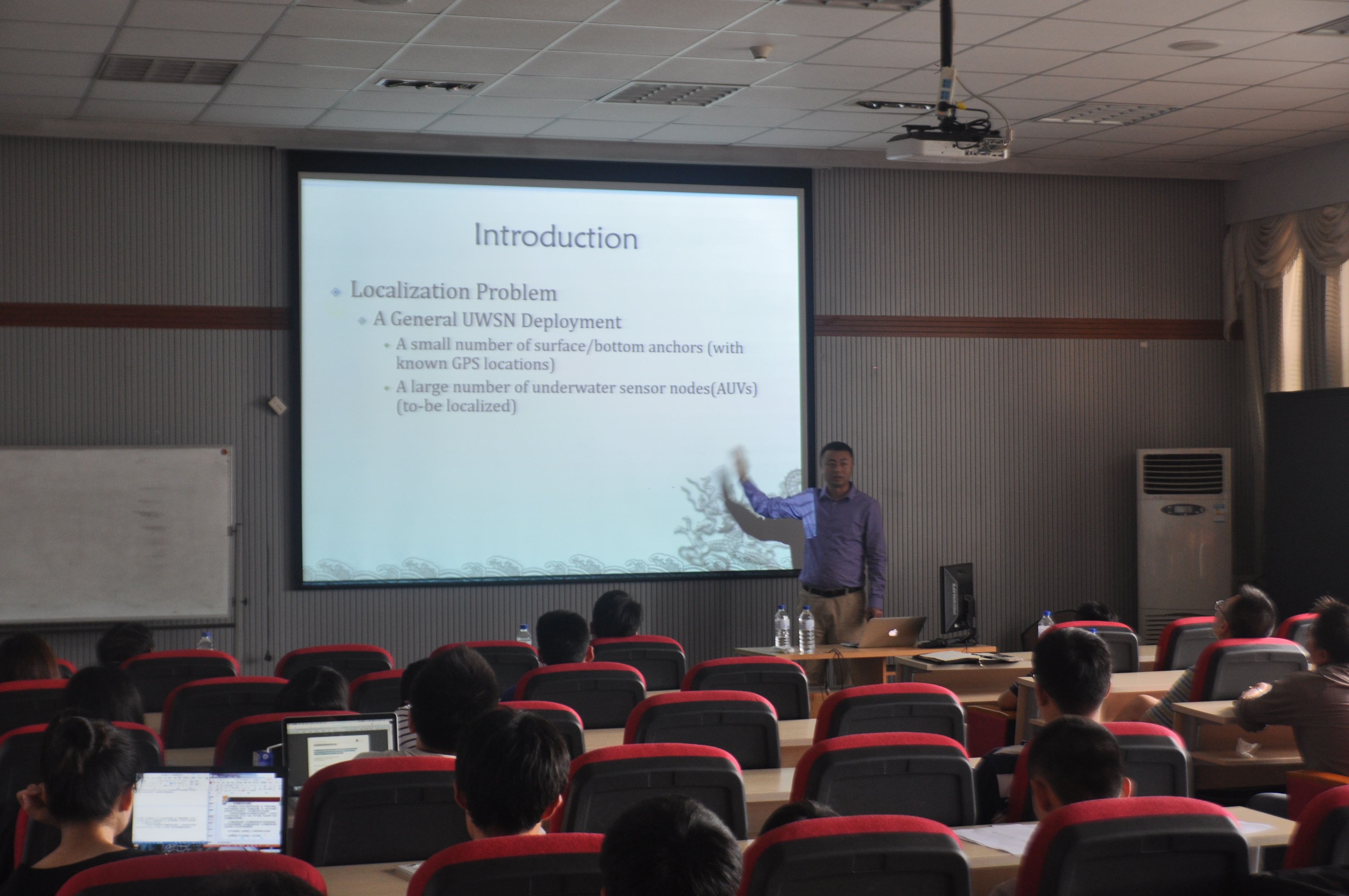 程伟教授主要介绍了三种与水下网络定位技术相关的技术,利用深度信息将3D定位转换至2D定位的技术、无需时间同步的距离检测测量技术和快速按需定位技术。上述三种技术的结合将实现快速、节能、兼具隐私保护能力的水下定位平台。报告内容深入浅出,参会人员认真学习并针对水下定位技术和算法优化等有关问题进行了讨论。最后整个讲座在热烈的掌声中结束了,参加此次报告的同学们均表示收获颇丰。