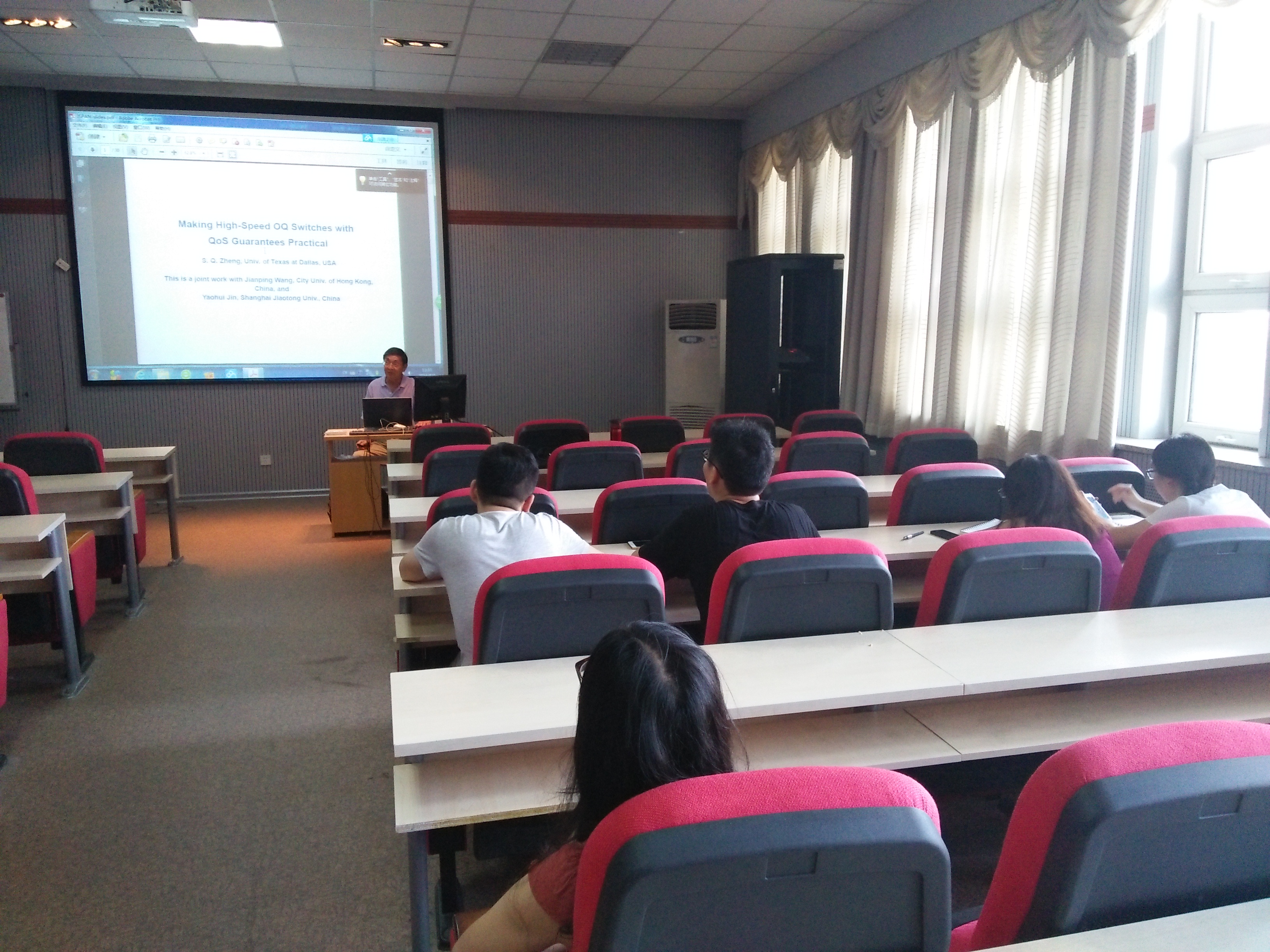 2016年8月4日下午13:30, 美国德州大学达拉斯分校终身教授、唐敖庆讲座教授郑斯清教授在sunbet申搏官方网站A521报告厅为计算机学院和软件学院的青年教师和研究生做了题为“Making High-Speed OQ Switches with QoS Guarantees Feasible”的学术讲座。该讲座的主要内容源于近期郑斯清教授与香港城市大学、上海交通大学合作研究的学术成果 – 构建易实现的高速输出排队交换结构。郑斯清教授同时在报告中讲解了研究和开发高速和可扩展交换结构的技术难点,以及介绍了该方面近十年的研究进展。整个讲座大约持续3个小时,分为两个阶段,主讲阶段约进行2个小时。主讲结束后,郑斯清老师解答了同学们提出的该方面的相关问题,同时,和同学们讨论了学术研究过程中寻找课题、研究方法等。