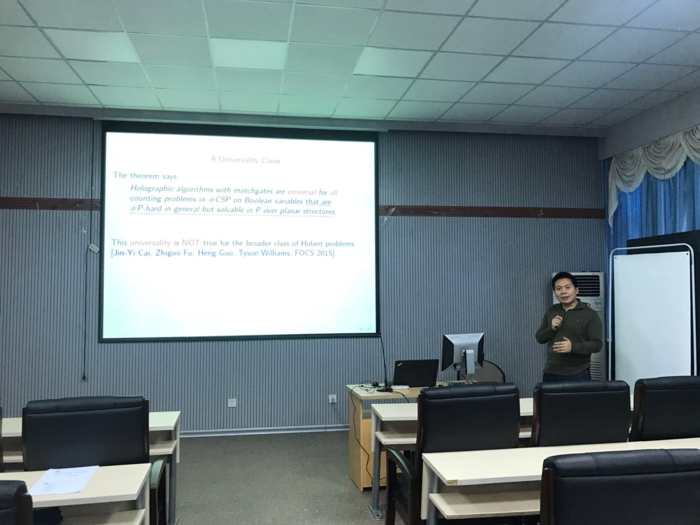 2017年12月13日上午,付治国博士在sunbet申搏官方网站计算机学院做了题为“Holographic Algorithm with Matchgates Is Universal for Planar #CSP Over Boolean Domain”的学术报告。付治国博士于2009年在sunbet申搏官方网站获计算数学博士学位,现为东北师范大学信息科学与技术学院副教授,2014年-2017年在美国威斯康星大学麦迪逊分校从事计算复杂性研究。主要研究方向为计数问题的计算复杂性、包括计数问题的计算复杂性分类、全息算法以及计数问题的近似算法和随机算法,已在STOC, FOCS, SIAM. J. Computing, J. Information and Computation等著名会议和期刊发表多篇论文。