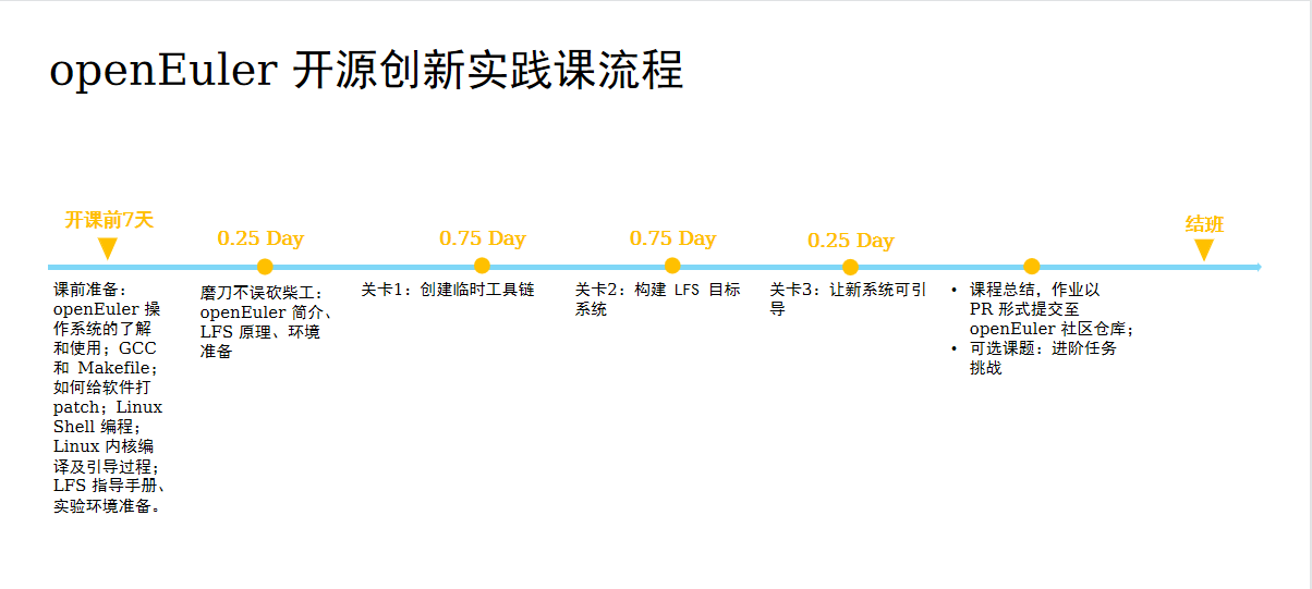 课程设计:创新实践课共分三个阶段,包括总计 7 天的课前准备学习,2 天 3 个关卡的课堂开发实战活动以及 2 天课后总结及作业提交;后期学生可以自主创新地完成进阶内容。课程流程见下图。