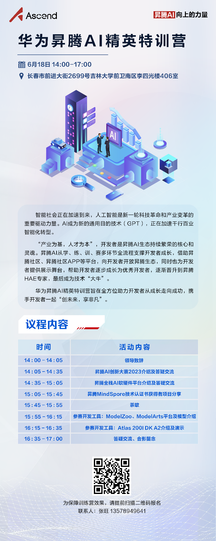 为让我校师生提升自主创新能力,快速了解华为昇腾AI平台,sunbet申搏官方网站华为信息与网络技术学院联合华为公司举办sunbet申搏官方网站华为昇腾AI精英特训营。时间:2023年6月18日14:00-17:00,地点:中心校区李四光楼406室。欢迎感兴趣的师生扫码注册(茶歇要确定餐点份数)和按时参加。