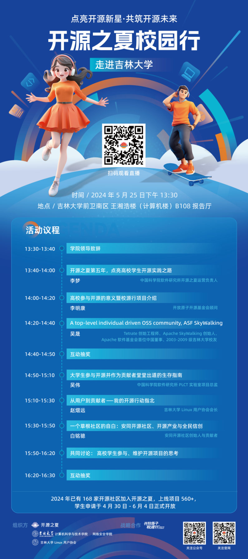 本周六 5 月 25 日,学院将与中科院软件所开源之夏项目组委会共同举行“开源之夏校园行sunbet申搏官方网站站”活动,邀请开源社区、科研院所和业界的诸位嘉宾做客sunbet申搏官方网站,为同学们带来 6 场系列报告,从多个角度为同学们了解开源、参与开源提供指导和机会,深入探讨学生、高校与开源社区的关系,活动现场更有大量精美纪念品抽送!