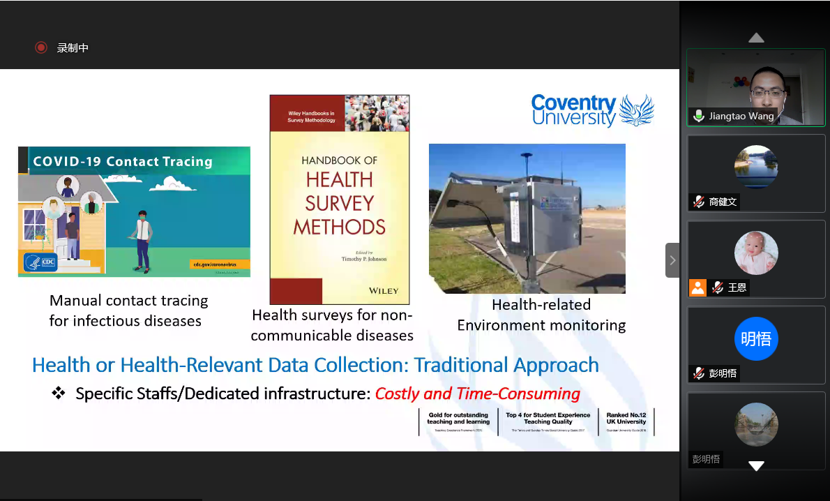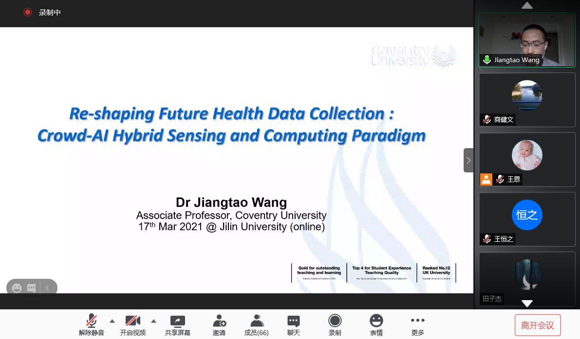 2021年3月17日下午,英国考文垂大学王江涛副教授应sunbet申搏官方网站邀请,以线上形式作了题为“重塑未来人群健康数据的收集:Crowd-AI混合感知和计算范例”的学术讲座。
