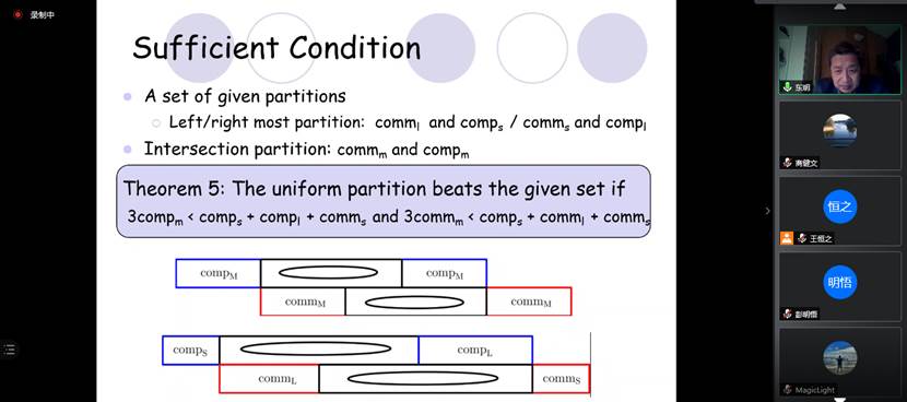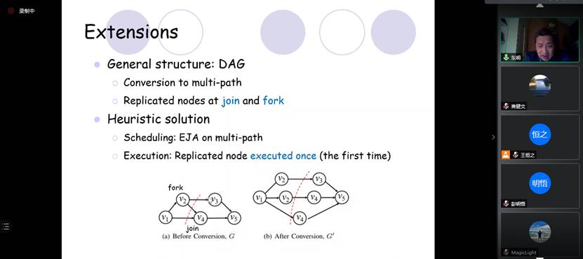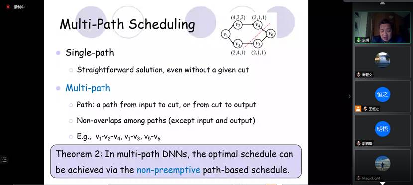报告会上,吴教授首先介绍了深度神经网络推理的问题背景,并结合随卷积过程的推进数据量越来越小的重要性质,引出了DNN在云(边缘)上的分割和调度问题。由于研究问题非常复杂(NP-hard),吴教授先讲解了问题的简单版本。