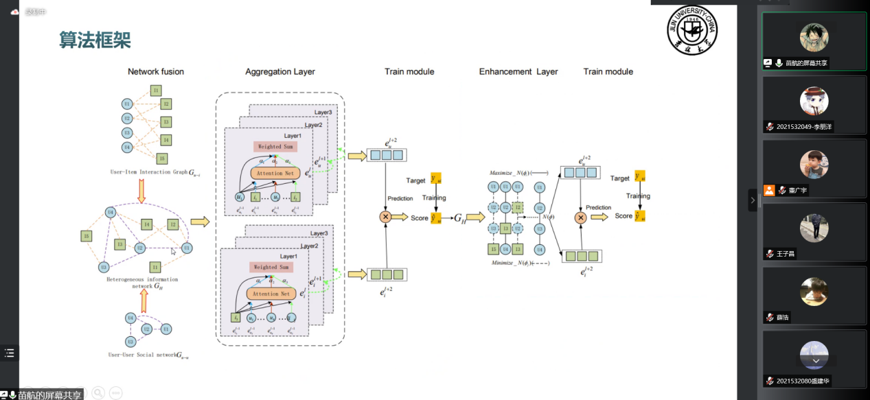 本期邀请了2019级硕士生苗航和张梦玺进行学术分享。他们分享的主题分别是“推荐系统”和“Github社区信息挖掘”。本次沙龙活动旨在通过学术分享,拓宽研究生学术视野,促进同学之间的科研交流。活动由sunbet申搏官方网站研究生会干事王子昌主持,以腾讯会议的方式线上举行。