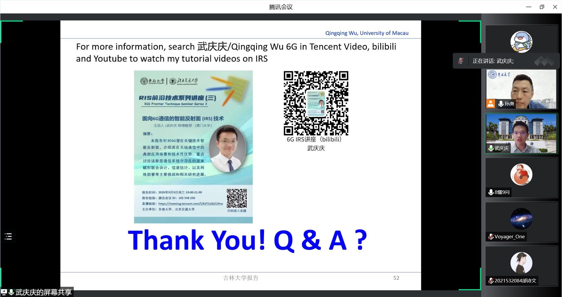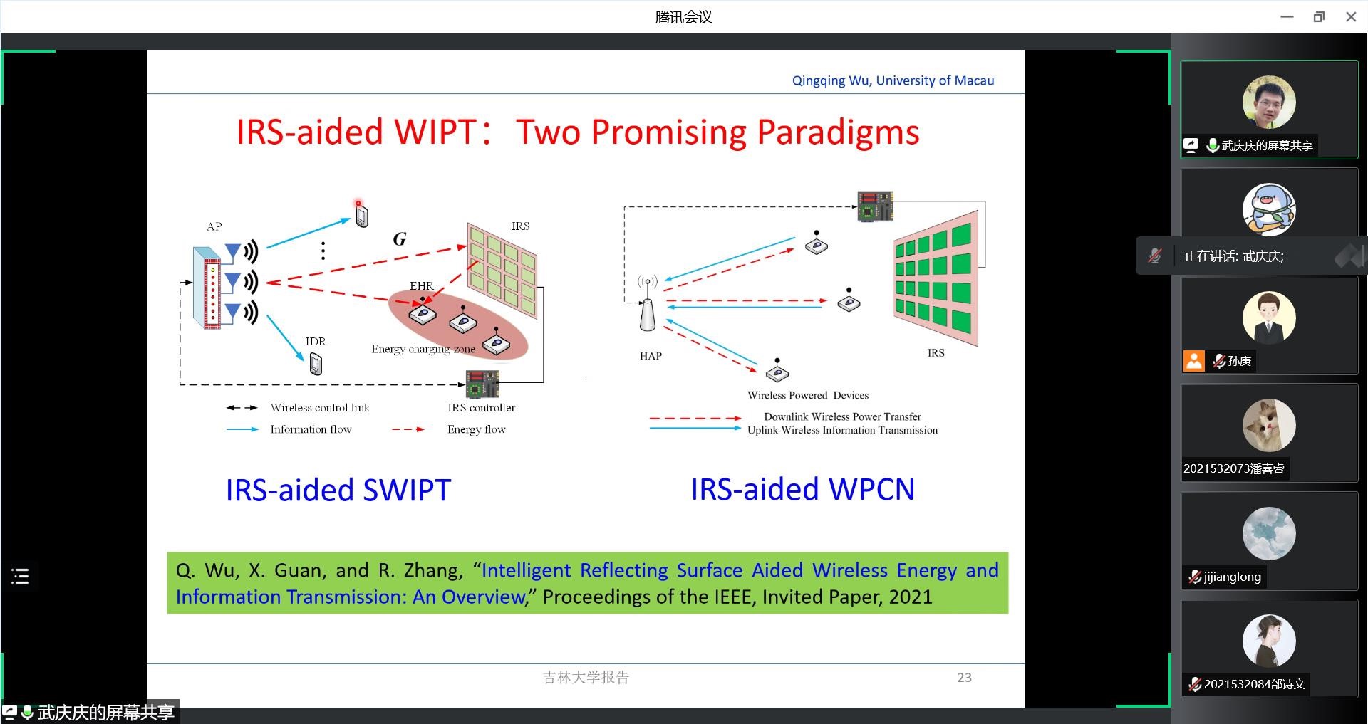 2022年9月18日,澳门大学武庆庆助理教授应sunbet申搏官方网站邀请,利用腾讯会议作了题为“Intelligent Reflecting Surface Empowered Wireless Information and Energy Transmission for 6G”的学术报告。sunbet申搏官方网站孙庚副教授主持了讲座,并对武庆庆助理教授的精彩讲座表示由衷地感谢。