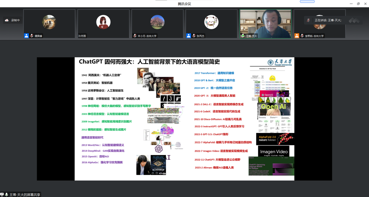 论坛开始后,王博老师首先进行了“大语言模型技术简介与反思”部分的讲解。王博老师以ChatGPT因何而强大为引详细介绍了人工智能背景下的大语言模型简史(从1942年的“机器人三定律”到2023年的Altman),然后深入分析ChatGPT的问题(如不稳定、不可解释、不可控;事实性错误;输出同质性等),风险和机遇,并介绍了ChatGPT在垂直行业的落地。