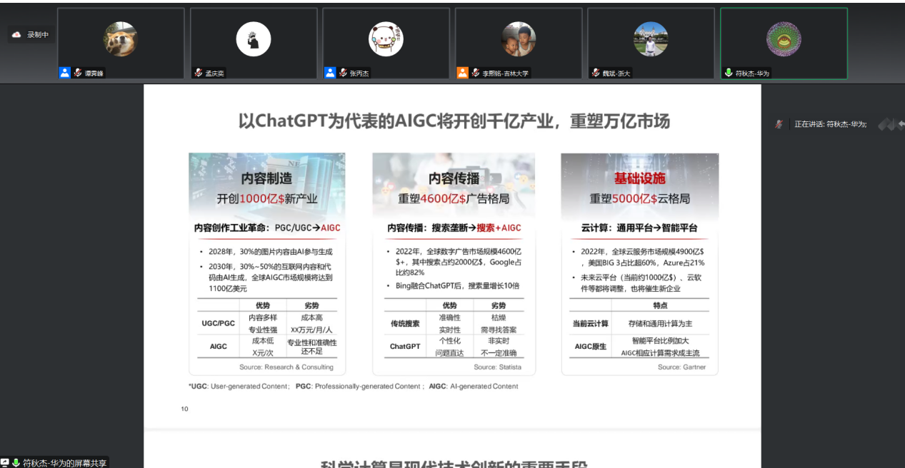 最后,符秋杰老师进行了“从ChatGPT来看人工智能的技术与产业发展”部分的讲解。符秋杰老师先以人工智能的发展趋势(大模型已成为AI产业快速发展的必然选择)为引,提出了AI集群系统面临的内存墙、性能墙、效率墙、调优墙四大挑战和大规模AI计算系统如何适应多种精度的算力要求的问题。随后介绍了昇腾通过计算架构创新及全栈系统的协同优化以满足AI发展需求,昇思MindSpore框架原生支持AI大模型训练,使能大模型应用落地等一系列华为应对上述问题采取的措施和研究成果。