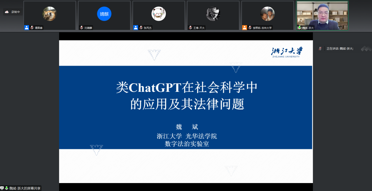 随后,魏斌老师进行了“类ChatGPT在社会科学中的应用及法律问题”部分的讲解。魏斌老师先大概叙述了类ChatGPT的背景,然后介绍了类ChatGPT在司法领域的应用:虽然相对于传统搜索引擎,ChatGPT通过庞大的预训练语料库催生更加精准而全面的回答,但在类案检索、法律法规检索、刑期预测等应用中依旧存在不准确问题。且ChatGPTA会产生歧视、仇恨伦理和排外;泄露敏感信息,破坏隐私;传播虚假或误导性信息等伦理问题与数据安全,训练数据著作权争议等法律问题。并提出了应对这些问题应进行构建人工智能伦理规范,推动符合伦理规范的技术研发,完善人工智能法律规范、促进法学与计算机科学的交叉研究的思路。