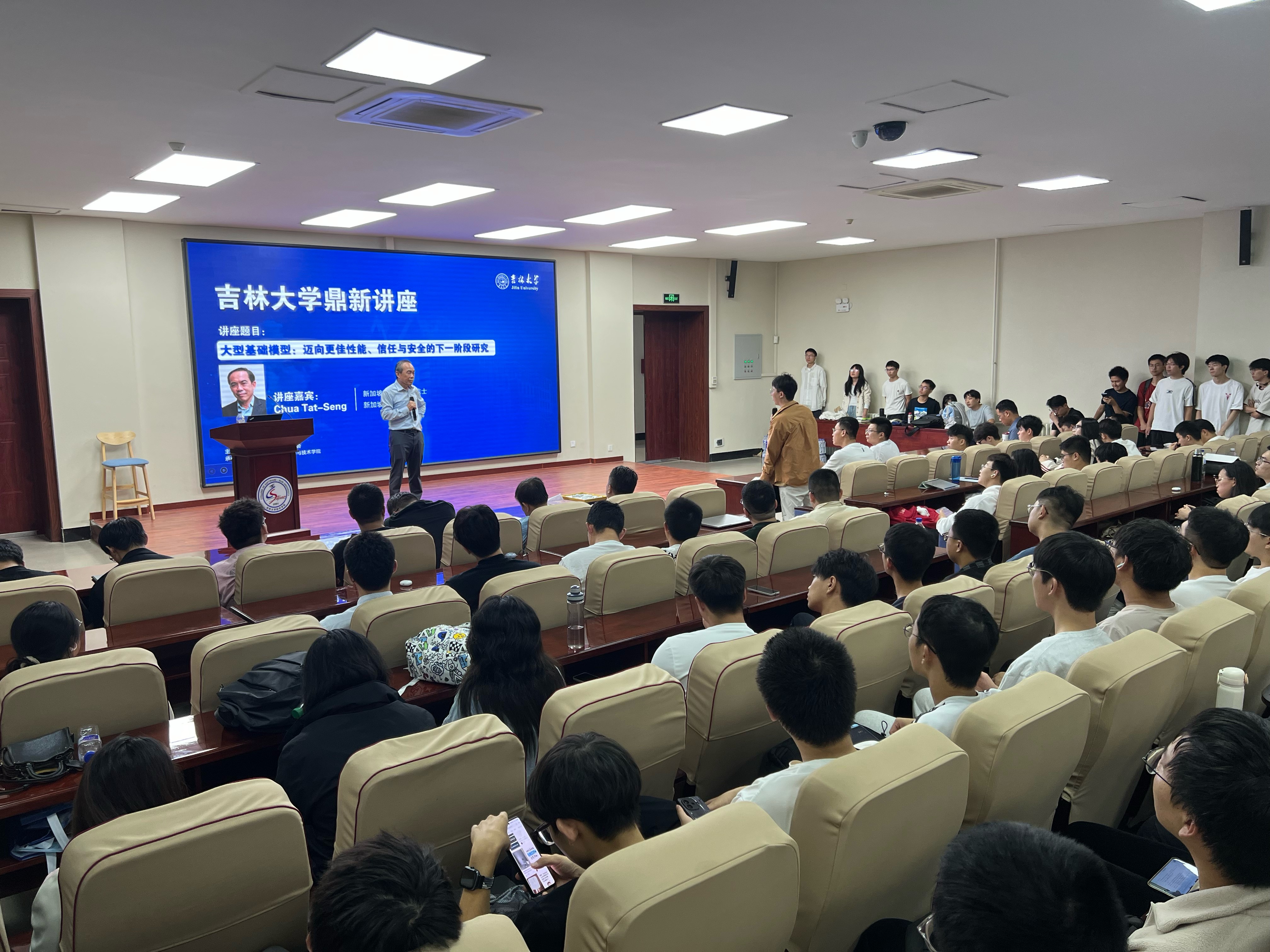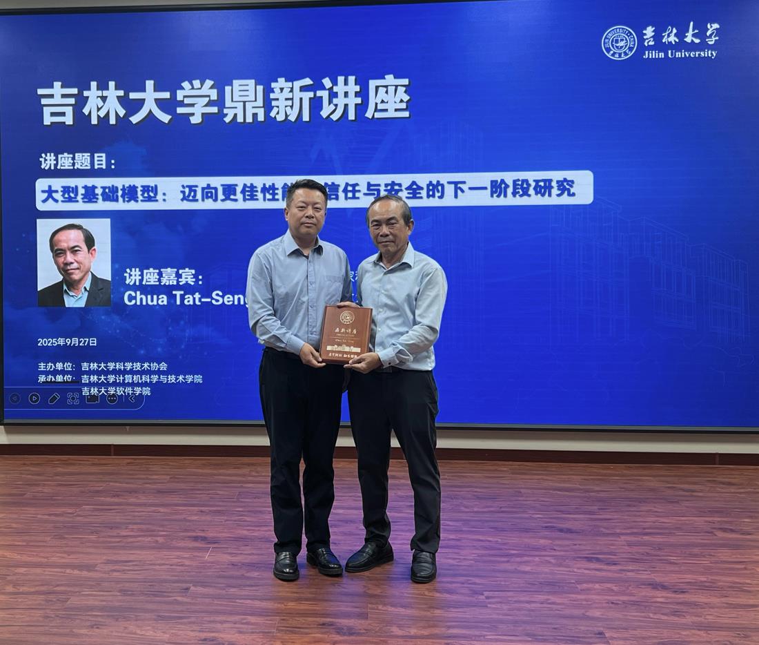 9月27日下午,新加坡国家科学院院士、新加坡国立大学计算机学院KITHCT讲席教授、新加坡国立大学与清华大学联合研究中心NExT的联合主任Chua Tat-Seng教授做客sunbet申搏官方网站鼎新讲座, 以“大型基础模型:迈向更佳性能、信任与安全的下一阶段研究” 为题,为吉大师生带来了一场精彩的学术讲座。sunbet申搏官方网站sunbet申搏官方网站副院长张永刚主持了讲座,sunbet申搏官方网站党委书记宫皓宇出席讲座并为Chua Tat-Seng院士颁发“鼎新讲座纪念牌”。