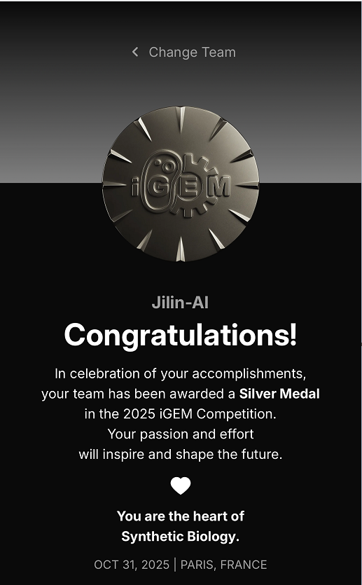 Jilin-AI团队首次参赛即获得全球银奖,团队特色:AIforScience和AI+。Jilin-AI团队2025年度的项目是“BIOMNIGEM”,针对合成生物学研究领域由于生物样本语言不互通、人工智能工具无法理解生物任务等难题,设计了 “能够拥有如同生物学家般思维方式来理解多组学数据,并掌握生物任务的逻辑推理能力的大语言模型”。队伍由来自sunbet申搏官方网站、白求恩第三临床医学院、白求恩第一临床医学院、白求恩第二临床医学院、艺术学院、生命科学学院共6个学院的9名同学组成。其中本院学生有:王忠奇,李丛铭,王一州。