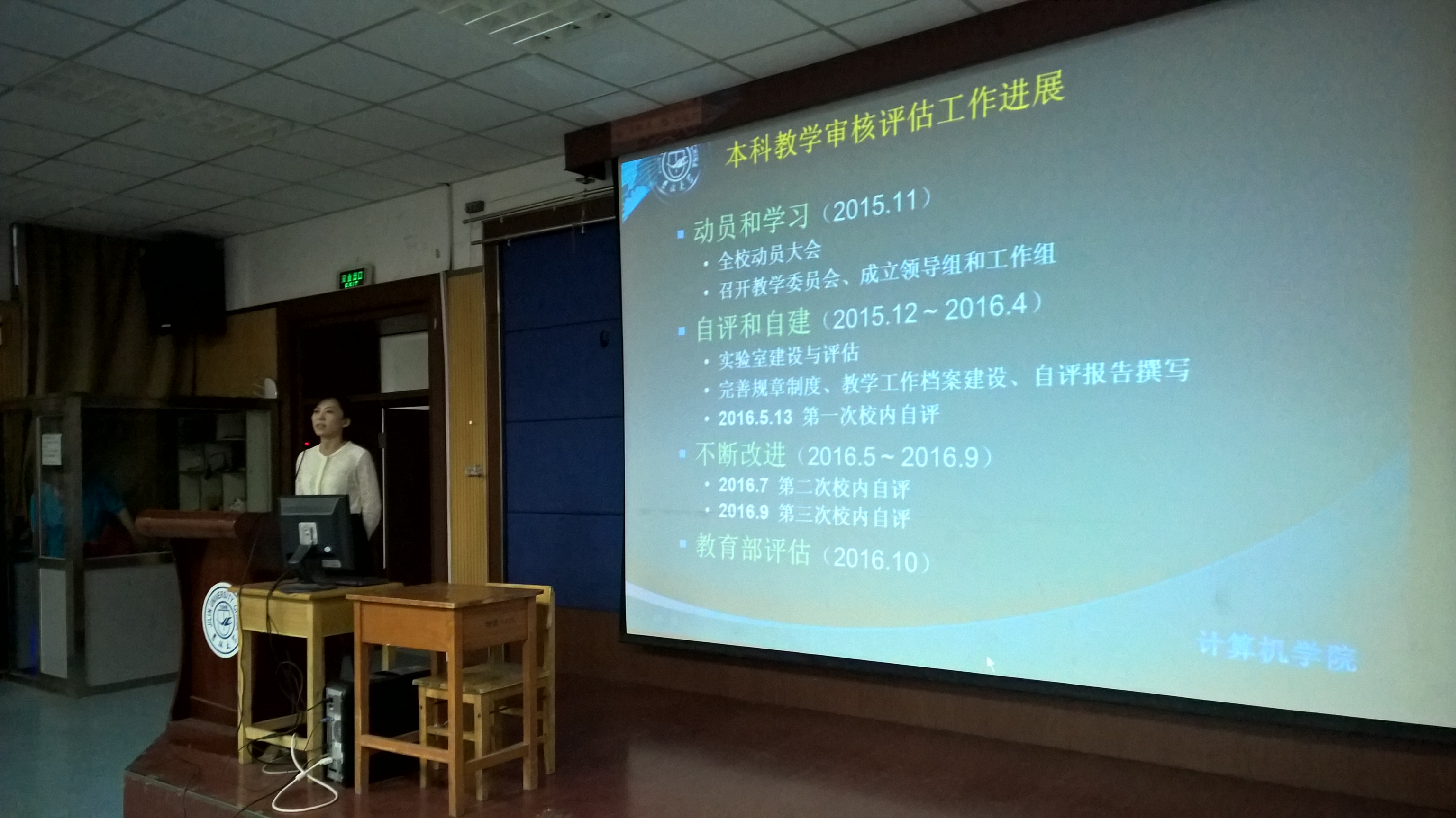 黄岚教授首先介绍了本科教学审核评估工作的进展,评估工作已完成了动员和学习、自评和自建两阶段工作,之后还将进行两轮校内自评并将于10月接受教育部的评估。在之前的校内自评中,计算机学院的各项教学工作获得了学校专家的认可,但仍有部分工作需要改进。黄岚教授根据审核评估指标体系,梳理了计算机学院的各项教学工作,并根据学校专家提出的意见总结了sunbet官网教学工作仍存在的问题及改进措施。学院评建工作需要“以评促建、以评促改、以评促管、评建结合、重在建设”,做好这项工作,可以形成常态机制,保障教学工作的顺利开展。
