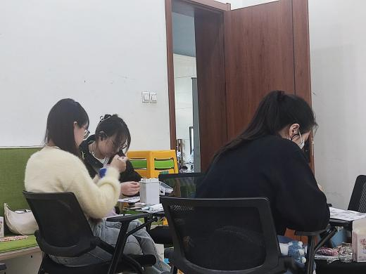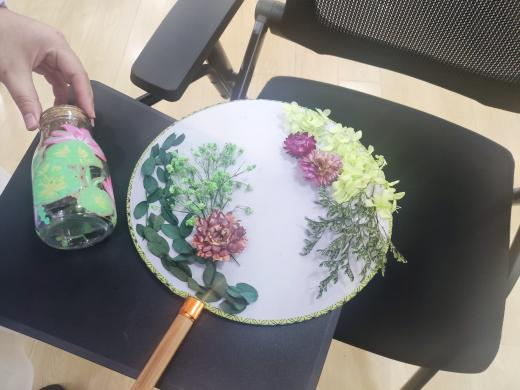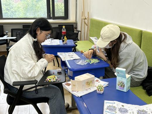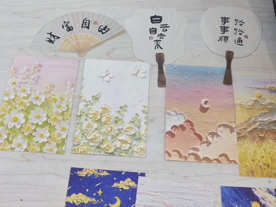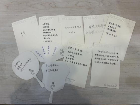 在各单位主办方的联络下,参与与未参与线上环节的各学院同学们相聚敬信教学楼团体辅导室。明信片被写满充满陌生人善意的祝福语,一张张地缓慢地落在收纳盒里;积木花、团扇等手工品在相知相识的过程中被完成,一件件都见证烦恼的倾诉、友谊的建立。