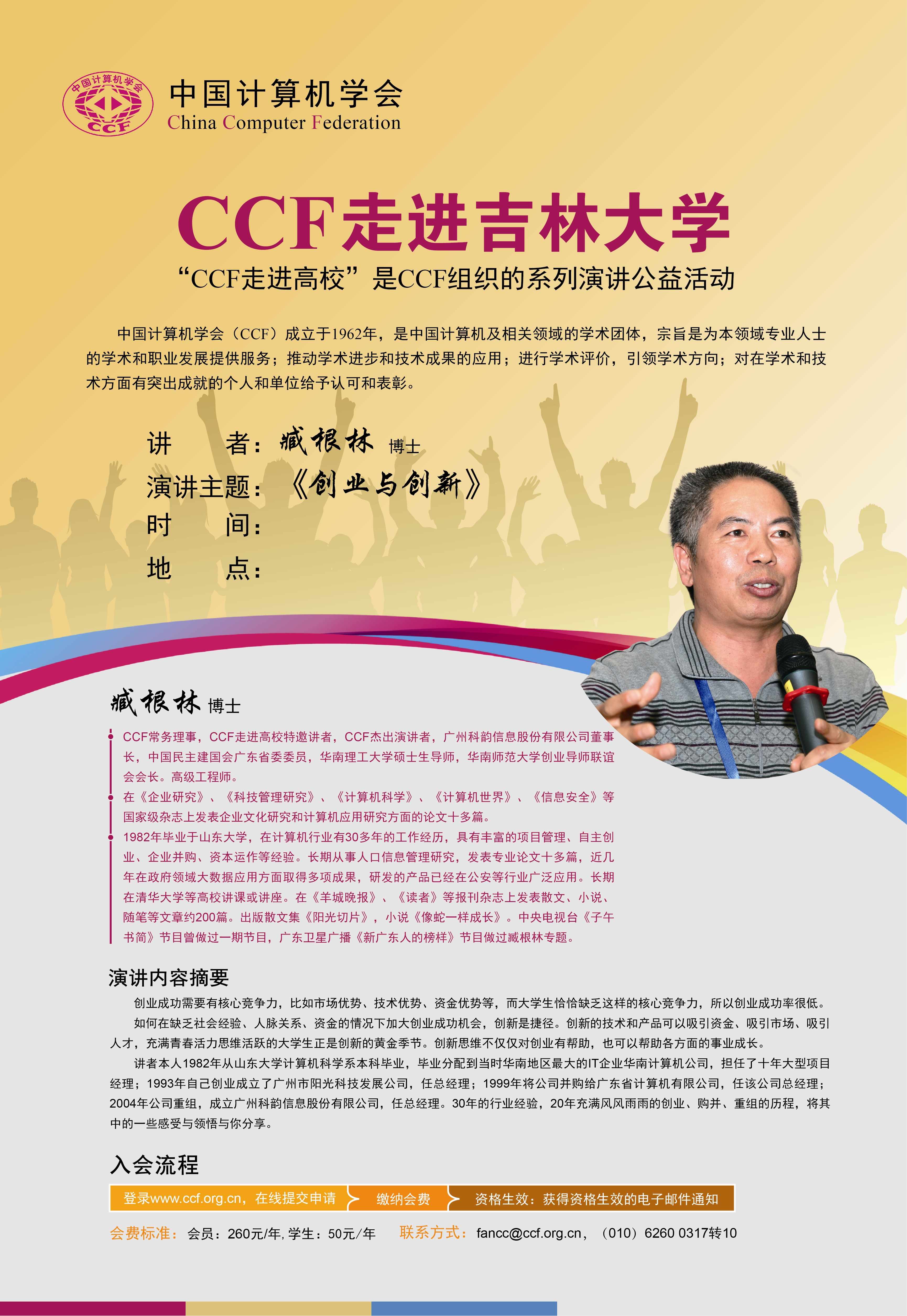 学院借CCF走进sunbet申搏官方网站之际,邀请创新创业培训专家臧根林,为sunbet官网师生做题为《创新与创业》主题报告,有意组队参赛的同学敬请关注。