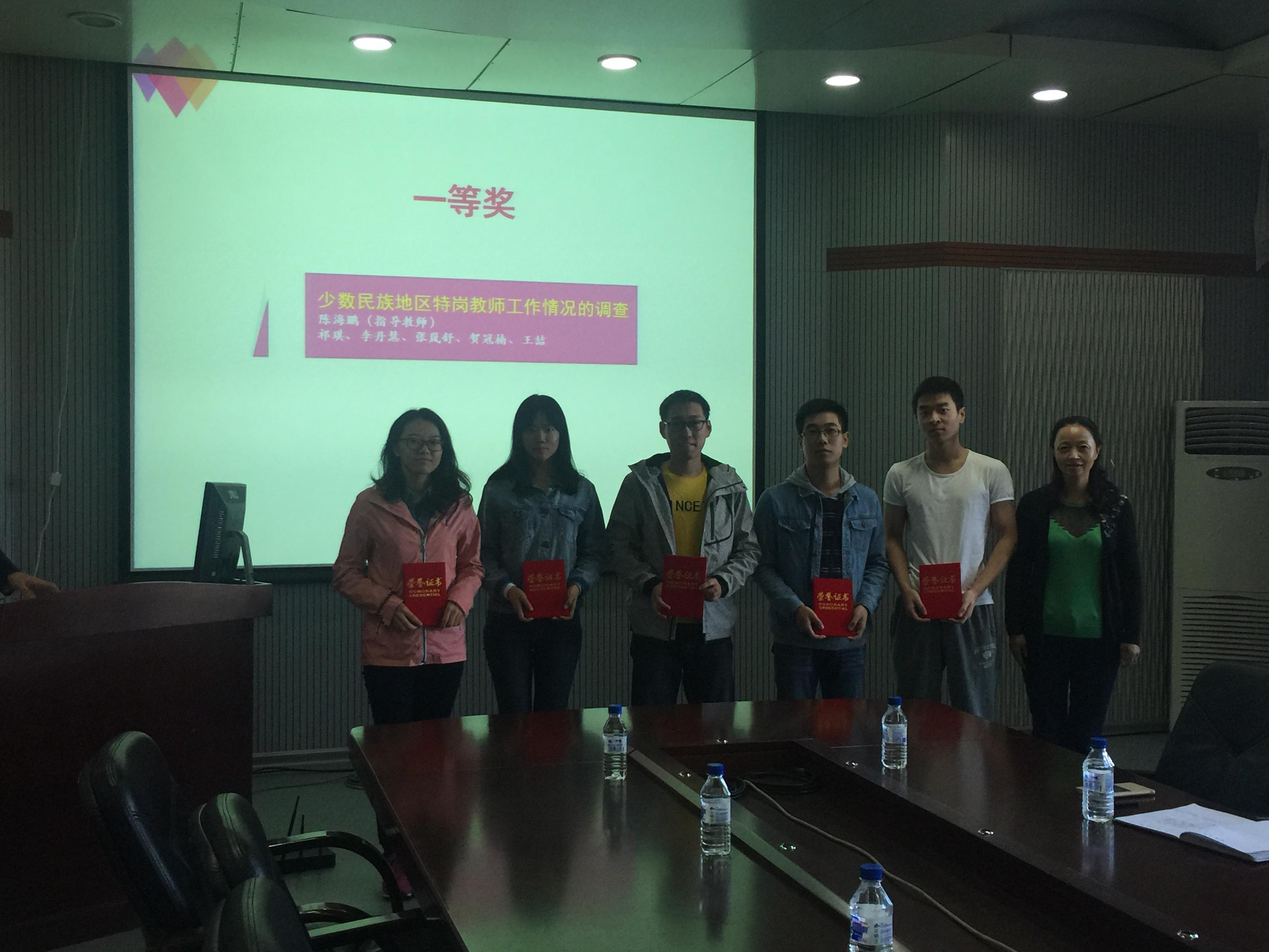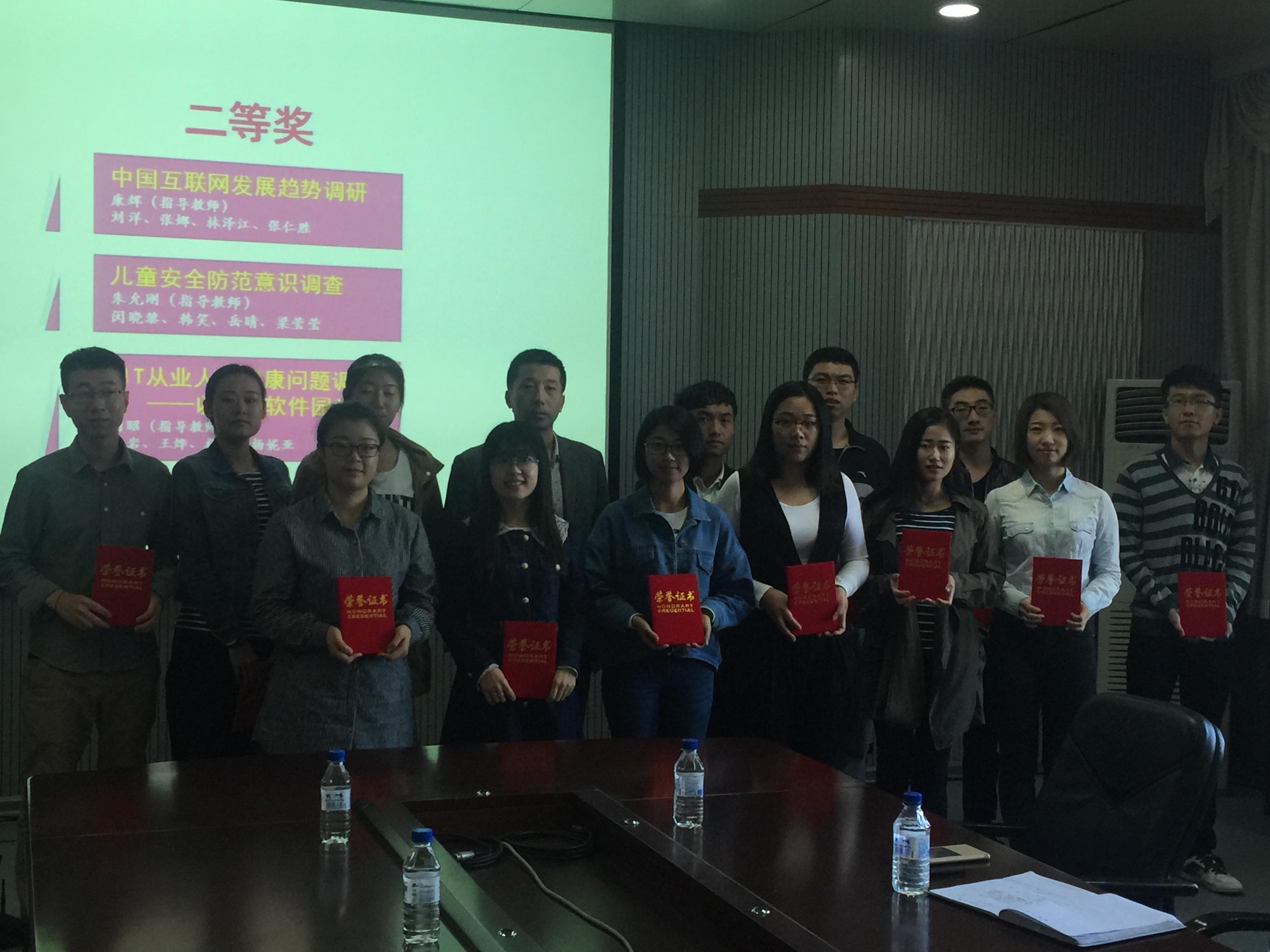 首先主持人回顾了本年度暑期社会实践内容,介绍了本次实践的特点,即参与人数多,学院支持力度大,调研主题涵盖广,成果收获足等。接下来由张霁雪老师为“互联网+旅游”实践团队,多民族图案演变的搜集及信息化数据挖掘团队、旅游地不文明行为调查团队颁发三等奖证书。杜天宝老师为中国互联网发展趋势调研团队、儿童安全防范意识调查团队、IT从业人员健康问题调研团队颁发二等奖获奖证书。郑爽老师为少数民族地区特岗教师工作情况调查团队颁发了一等奖获奖证书。颁奖过后,三支优秀队伍对本次暑期社会实践内容作了经验分享。