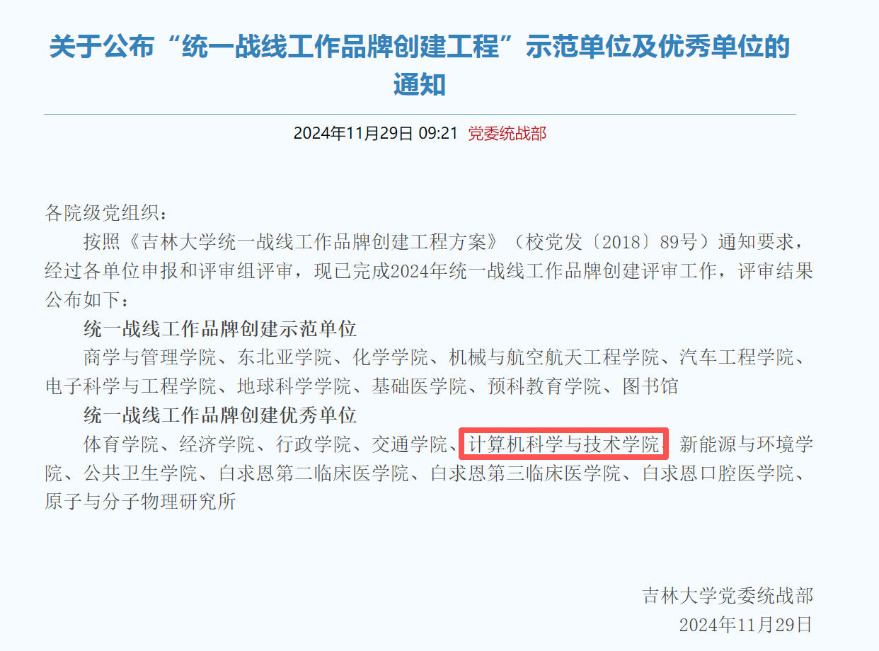 2024 年 11 月 29 日,党委统战部公布 “统一战线工作品牌创建工程” 示范单位及优秀单位评审结果,学院党委成功入选。