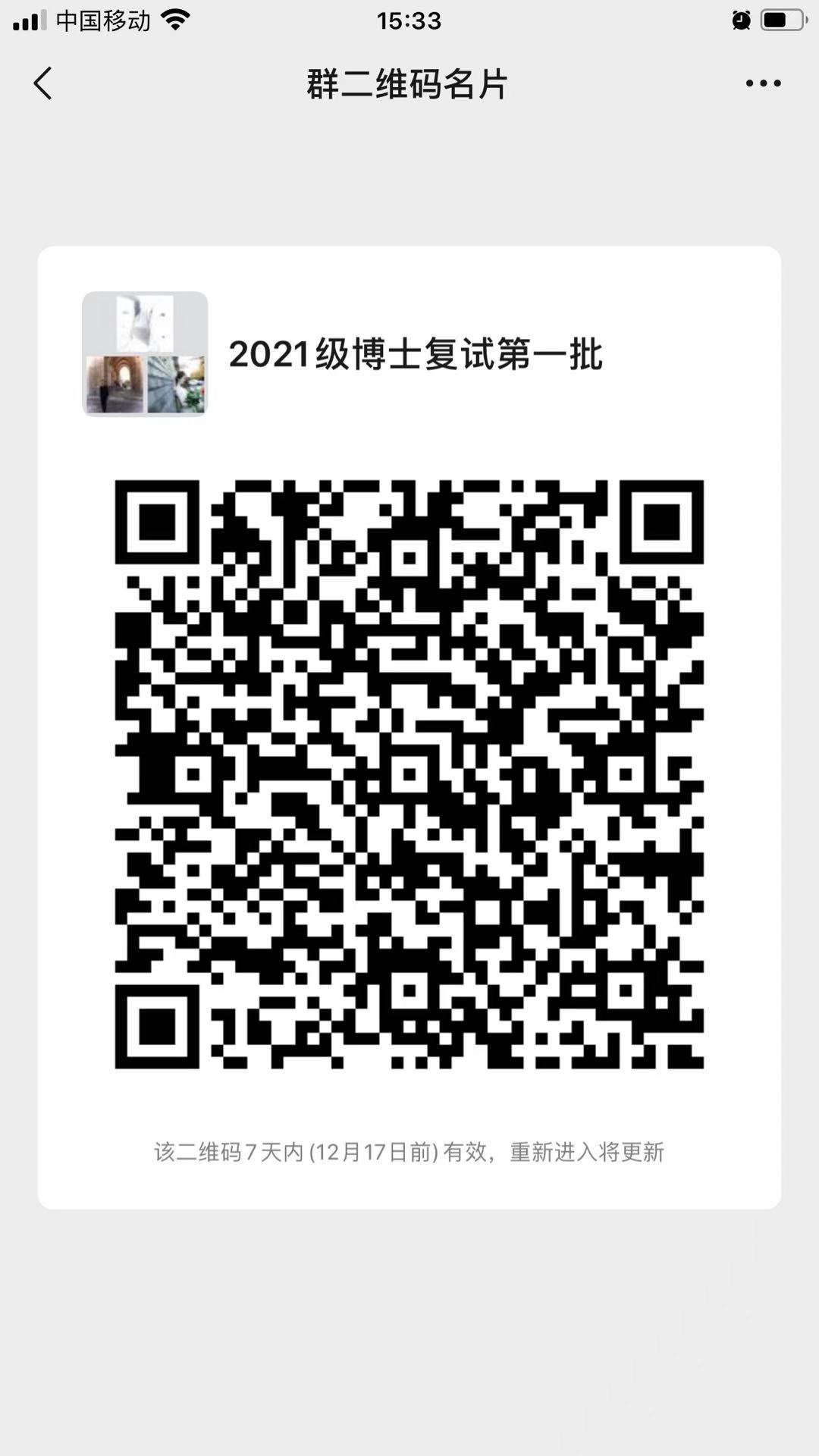 请进入复试的考生于本周五(12月11日)上午10点前扫描下方二维码加入微信群并回复 “***(姓名)确认参加12月17日/18日复试”。