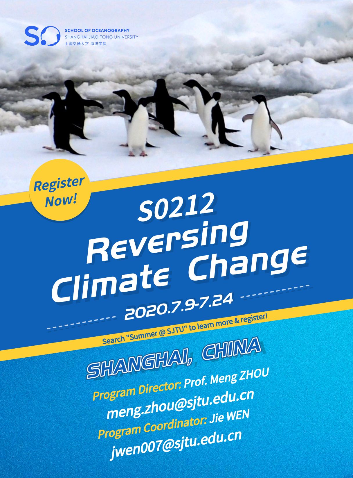 School of Oceanography at Shanghai Jiao Tong University welcomes undergraduate and graduate students from all over the world to study in Shanghai, one of the most dynamic cities in China. This summer, we invite you to enhance your academic credentials and explore your interests with us at S0212 Reversing Climate Change.